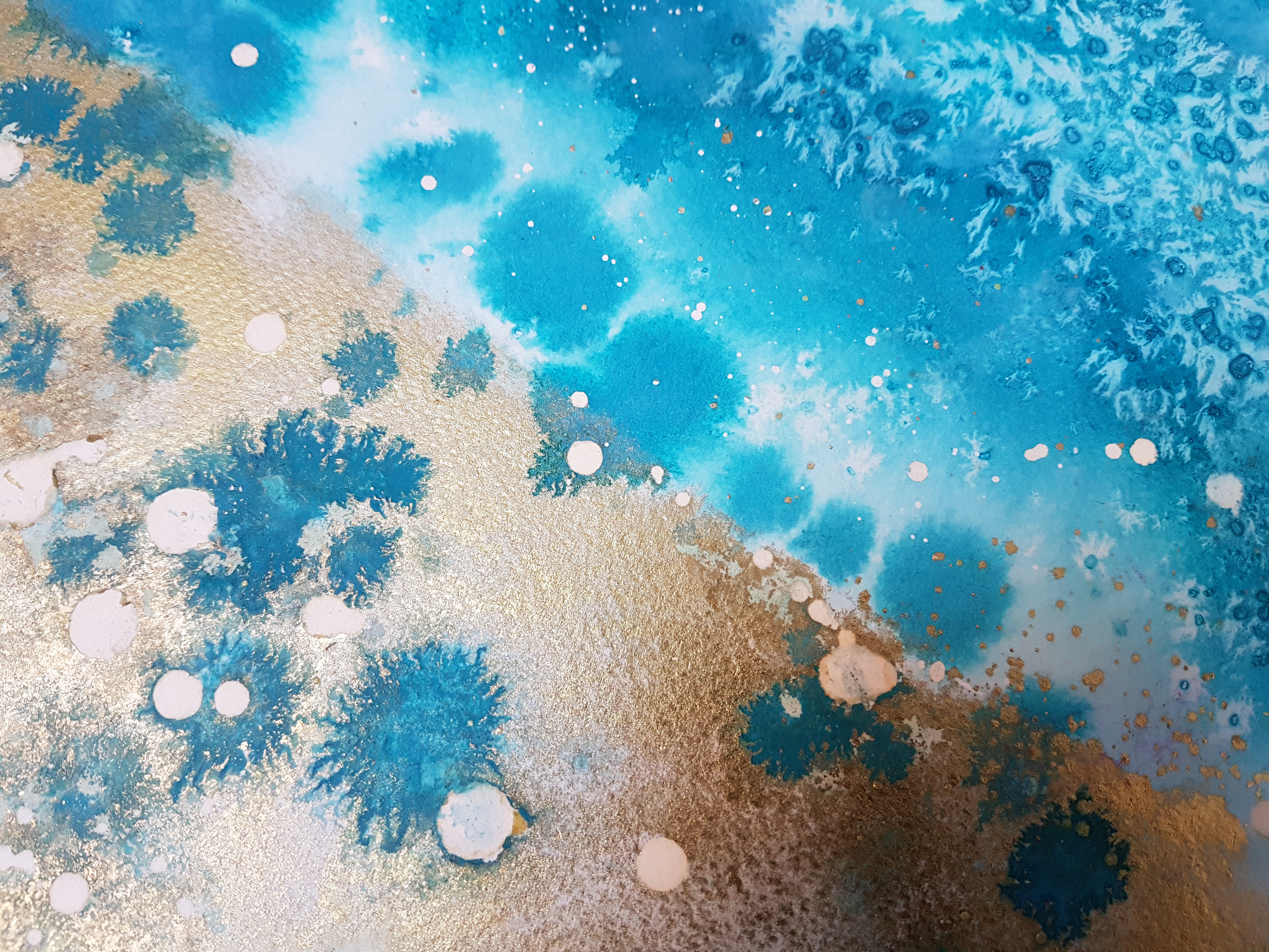 A large 100x80cm turquoise and gold abstract commission inspired by the mesmeric light in a coral atoll (aeriel view).